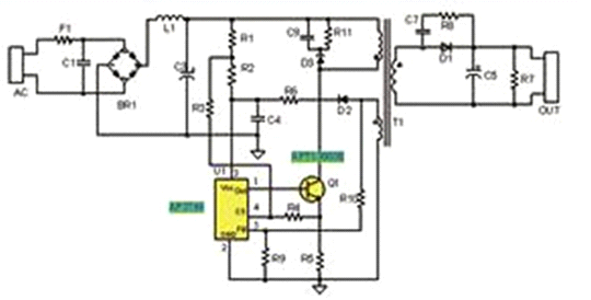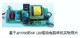 1. 基于最新的LED專用驅動芯片AP3766,采用原邊控制方式,無須光耦和副邊電流控制電路,實現隔離恒流輸出,電路結構簡單。通過電阻R5檢測原邊電 流,控制原邊電流峰值恒定,同時控制開關占空比,保持輸出二極管D1的導通時間和整個開關周期時間比例恒定,實現了輸出電流的恒定。