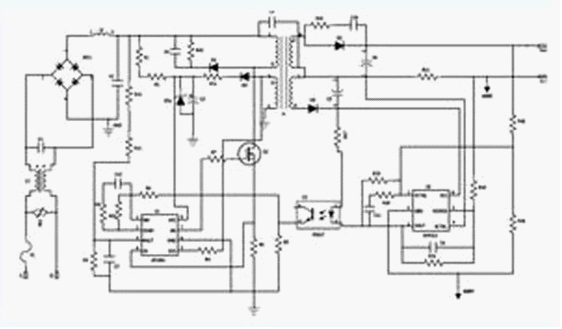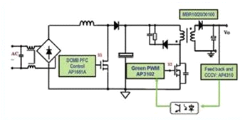 在更大功率應用條件下,單級PFC電路難以同時兼顧PFC預調整和反激電路輸出恒流調整性能,這時需要采用兩級電路架構實現這一目標。因此,有新推出的PFC+PWM 兩級架構電路拓撲方案,該方案電路原理圖如圖9所示。
