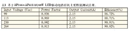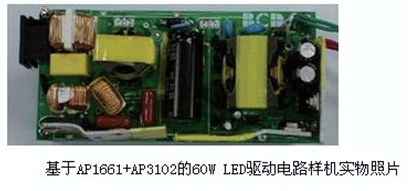 AP1661是一款工作于臨界導通模式下的有源功率因數校正控制芯片,可廣泛應用于開關電源、LED驅動和電子鎮流器的預調整變換器控制。該芯 片內部包括1個啟動定時器可滿足待機應用要求,1個能實現接近于1的功率因數的單象限乘法器和1個零電流檢測模塊確保臨界斷續方式工作。AP1661的圖 騰柱驅動輸出能夠為外部MOSFET或IGBT提供最大600mA驅動電流和800mA關斷電流能力。采用了先進的雙極型互補金屬氧化物半導體設計和制造 工藝,具有低啟動電流,低工作電流和低功耗的特點。AP1661同時具有完善的保護功能,包括過壓保護、帶有滯后的輸入欠壓鎖定和乘法器輸出嵌位以限制開 關最大峰值電流。圖7為該方案60W應用電路樣機實物照片。圖8為應用該方案LED直管燈實物照片。