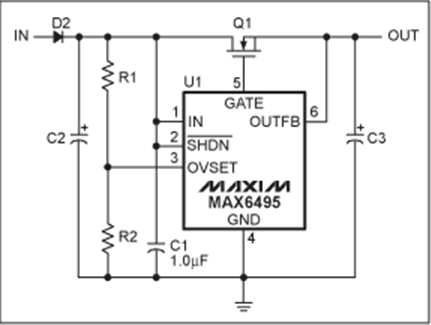 MAX6495–MAX6499/MAX6397/MAX6398過壓保護(OVP)器件用于保護后續電路免受甩負載或瞬間高壓的破壞。器件通過控制外部串聯在電源線上的n溝道MOSFET實現。當電壓超過用戶設置的過壓門限時,拉低MOSFET的柵極,MOSFET關斷,將負載與輸入電源斷開。