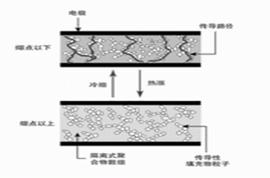 PPTC電路保護組件是以特殊塑料及傳導(dǎo)性粒子混合而成的傳導(dǎo)式聚合物,如圖1所示。在常溫下,該傳導(dǎo)性粒子會在聚合物中形成低阻值鏈路,當溫度上升超過該組件的切換溫度時,聚合物中的微晶粒就會熔化,變成非結(jié)晶狀。當微晶粒階段熔化期間數(shù)量增加時,會使傳導(dǎo)性粒子分離,導(dǎo)致該組件內(nèi)阻抗呈非線性增加。產(chǎn)生熱的原因是由于周圍環(huán)境或電池溫度上升所致,也可能受到過電流狀態(tài)下阻抗加熱引起,或是因前述不當?shù)某潆姰a(chǎn)生。