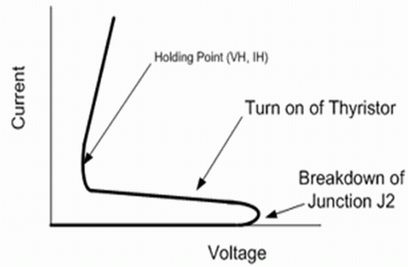 晶閘管的過壓保護(hù)設(shè)備是基于一對(duì)雙極性晶體管,這一對(duì)雙極性晶體管是由四層不同摻雜的N,P極組成,如圖1所示。N型摻雜的N1,P型摻雜的P1,和N型摻雜的N2分別構(gòu)成NPN晶體管的發(fā)射極,基極和收集極,而P型摻雜的P2,N型摻雜的N2,和P型摻雜的P1分別構(gòu)成了PNP晶體管的發(fā)射極,基極,和收集極。這樣一來一個(gè)晶體管的收集極是另外一個(gè)晶體管的基極。按這種方法那么一個(gè)晶體管的發(fā)射極到收集極流過的電流就是流向另一個(gè)晶體管的基極的電流。如果加一個(gè)從陽極到陰極的正電壓,那兩個(gè)三極管的發(fā)射極與基極之間,即J1和J3,都是正向電壓偏置。只有J2處PN結(jié)形成反向電壓偏置時(shí)才能阻礙電流流動(dòng)。如果從陽極到陰極的電壓增加到大于J2處PN結(jié)的擊穿電壓,電流就開始直接流向兩個(gè)雙極性晶體管的基極。這使得兩個(gè)三極管都導(dǎo)通,會(huì)導(dǎo)致含有兩個(gè)三極管的晶閘管的電阻下降,并且晶閘管兩端的電壓也會(huì)減小。如圖2所示我們可以看到晶閘管的從陽極到陰極的正電流存在時(shí)的電壓-電流曲線。有著這樣的電壓-電流曲線特性的保護(hù)器件一定會(huì)有非常優(yōu)秀的保護(hù)特性。當(dāng)保護(hù)器件在觸發(fā)后,工作電壓下降時(shí)保護(hù)器件可以承受大的電流并且自身功耗很小。事實(shí)上,具有這種電壓-電流曲線特性的保護(hù)器件通常被稱為“消弧”保護(hù)器件,因?yàn)檫@就好比是通過把一個(gè)“金屬消弧”放置在需要保護(hù)的端口來實(shí)現(xiàn)保護(hù)作用的。值得注意的是只有當(dāng)電流或者電壓降到閾值點(diǎn)以下,才能使得晶閘管回到高阻態(tài),如圖2所示。