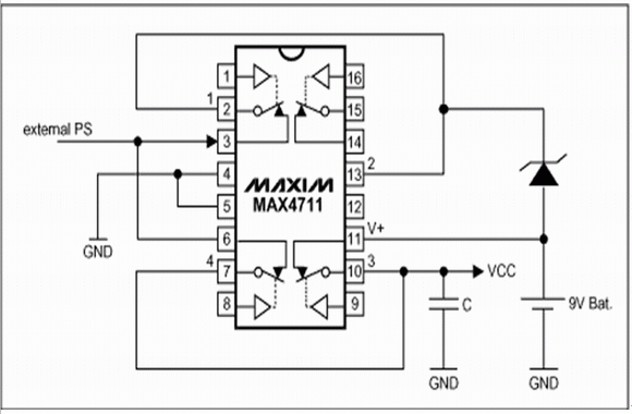 在圖8所示電路中,低電壓故障保護(hù)開關(guān)在檢測(cè)到有外部電源(如墻上適配器)接入時(shí),會(huì)切斷內(nèi)部電源(一節(jié)9V電池或兩節(jié)串連的鋰電池)。通常情況下,開關(guān)由電池通過13引腳供電。低電壓肖特基二極管阻止非充電電池被外部電源充電。