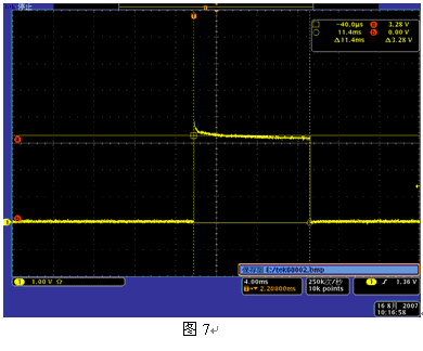 短路情況:多次短路測試發現保護IC(MM3177)能很好的起到短路保護作用,短路延遲時間11.4 ms。短路其短路電流情況如圖7(多次測試發現每次短路延遲時間變化微小,取其中較大的一次),此時測試到短路電流為16.4A。