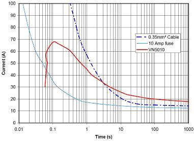 在圖5的示例中有一個點,智能開關 (VN5010)將繼續前行,而電線將開始自毀(紅線在藍色虛線上方)。如果這種情況是真實的,甚至連電路板都可能會自毀。現在考慮到涌流要求很可能更加嚴格,我們開始意識到有必要開發一個能夠仿真熔斷器特性的保護算法。