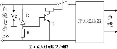 圖3為用晶體管和繼電器所組成的保護電路,在該電路中,當輸入直流電源的電壓高于穩(wěn)壓二極管的擊穿電壓值時,穩(wěn)壓管擊穿,有電流流過電阻R,使晶體管T導通,繼電器動作,常閉接點斷開,切斷輸入。輸入電源的極性保護電路可以跟輸入過電壓保護結合在一起,構成極性保護鑒別與過電壓保護電路。
