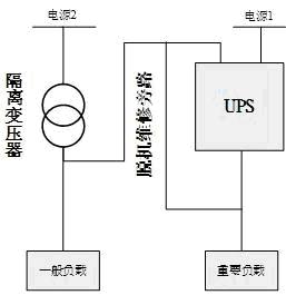 如圖一所示,這個是石化行業典型的兩電源的UPS構架,由兩路電源,一個隔離變壓器、一臺UPS組成。UPS采用雙電源回路輸入,UPS主電源由電源1提供,UPS旁路電源有電源2提供,同時UPS設置一個脫機維修旁路,允許UPS在故障維修或者更換時,系統仍然能夠正常工作。同時DCS系統中的負載分為兩個級別,即一般負載和重要負載,重要負載(一級負荷)由UPS系統直接供電,一般負載(三級負荷)由電源2經隔離變壓器后供電。