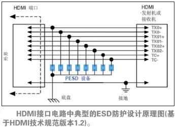 圖6.HDMI接口電路中典型的ESD防護設計原理圖(基于HDMI技術規范版本1.2)。