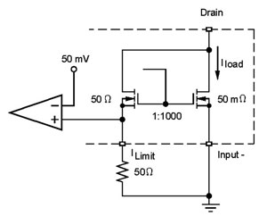 電子熔絲使用SENSEFETTM來開關(guān)電源、限制電流及監(jiān)測輸出電流。SENSEFET的優(yōu)勢是僅測量小部分的負載電流。沒有SENSEFET,全部負載電流將要流經(jīng)感測電阻,而這將需要大功率、極低阻抗的電阻。與價格不足1美分的小型片式電阻相比,這些電阻較昂貴。
