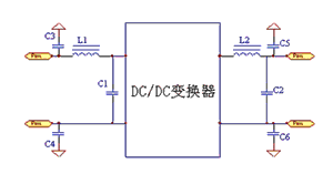 為了抑制外來的高頻干擾,也為了抑制DC/DC變換器對外傳導干擾,通過在DC/DC變換器的輸入端、輸出端設計濾波電路,抑制共模、差模干擾,降低EMI電平。其中,C1、C2、C3為差模濾波電容,C4、C5為共模濾波電容,L1為共模扼流圈,L2為差模濾波電感。