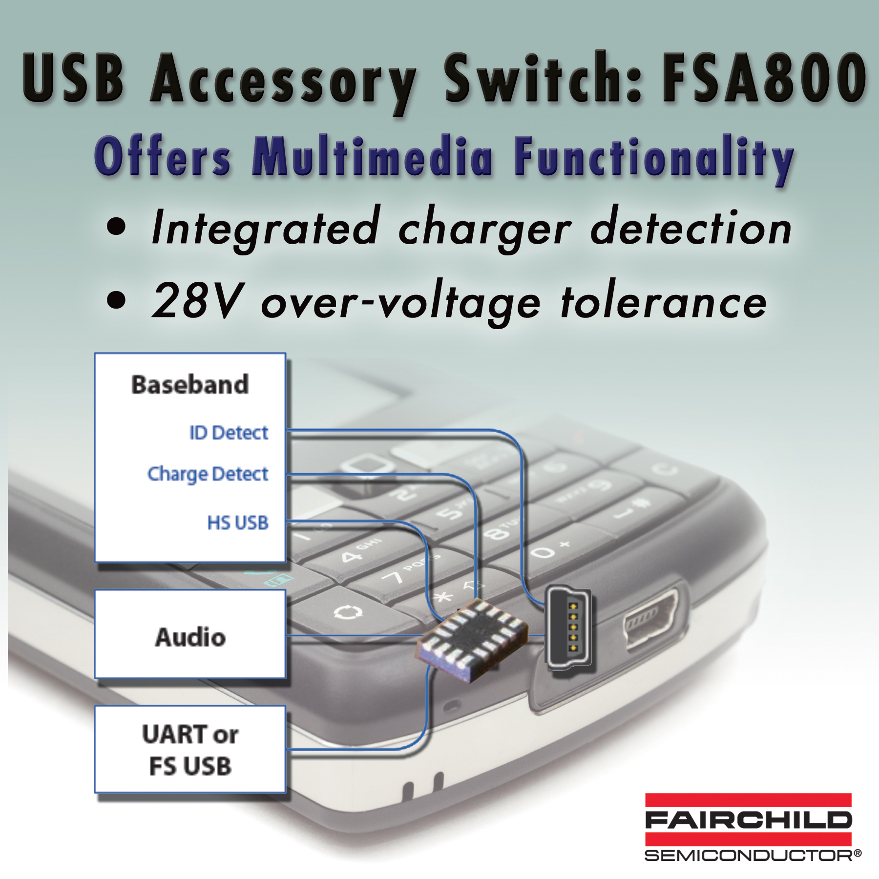 飛兆半導(dǎo)體公司 (Fairchild Semiconductor)為手機、PDA和MP3播放器設(shè)計人員提供全新USB附件開關(guān)產(chǎn)品FSA800。FSA800是業(yè)界最小的器件,將所有主要的多媒體功能集成進薄型UMLP封裝(1.8mm x 2.6mm x 0.55mm)中。它具有內(nèi)置充電檢測功能、28V的過壓容差、內(nèi)置終止電阻器,以及負擺幅功能。通過在緊湊型封裝中集成了多種功能,可以簡化便攜設(shè)計并減少外部元件數(shù)目。