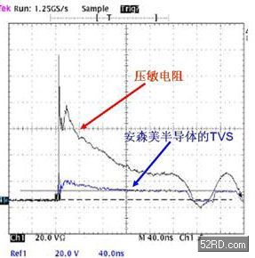 圖3:TVS元件與壓敏電阻在8kVIEC61000-4-2應(yīng)力沖擊測(cè)試下的輸出波形對(duì)比