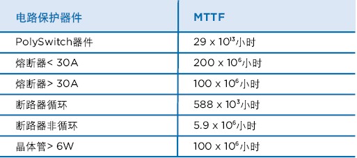 表2按照電信行業的可靠性預測標準Bellcore TR332比較了PolySwitch器件與其他電路保護器件的MTTF。