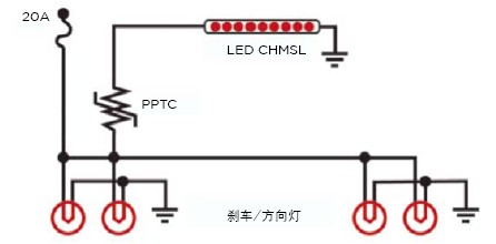 發光二極管(LED)所具有的低功耗和設計靈活性使其在照明電路中的應用日益普及,包括中置高位剎車燈(CHMSL)。在這種應用中用LED取代白熾燈的好處在于,能使用小規格低電流導線方便地在車頂內襯和靠近鉸鏈處不容易彎曲的連接中輕松地進行布線,如圖6所示。采用PolySwitch器件和分散式架構保護LED CHMSL照明應用提高了設計靈活性,減少了導線數量和重量并提高了可靠性。