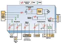 圖2描述了一個典型的用于安防和火警系統的電路保護方案。其中,過流保護是通過PolySwitchPPTC器件實現的。過壓保護是通過金屬氧化物變阻器和PESD器件實現的,并且集成了前面所描述保護設備I/O端口的PolyZen和2Pro器件。
