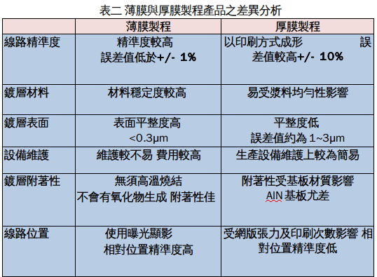 但從產(chǎn)品成本結(jié)構(gòu)來(lái)看,如表二所示薄膜產(chǎn)品的工藝設(shè)備(黃光微影)與生產(chǎn)環(huán)境(無(wú)塵或潔凈室)相較于厚膜產(chǎn)品其成本較高,然而薄膜工藝的金屬線路多以厚銅材料為主,相較于厚膜印刷之厚銀而言,材料成本卻相對(duì)較低,因此,可預(yù)期的當(dāng)利用薄膜工藝將陶瓷基板金屬化的產(chǎn)品,日漸達(dá)到經(jīng)濟(jì)規(guī)模時(shí),其成本將逐漸趨近于厚膜產(chǎn)品。