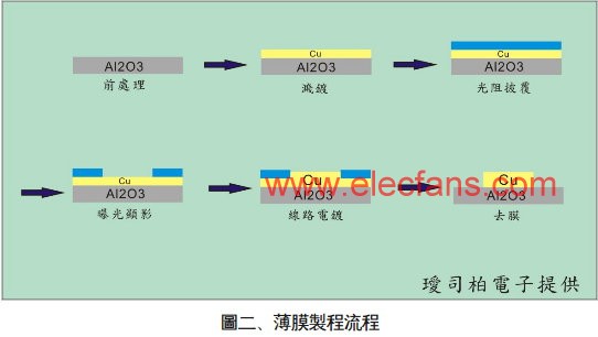 薄膜技術(shù)的導(dǎo)入正可解決上述線路尺寸縮小的工藝瓶頸,結(jié)合高真空鍍膜技術(shù)與黃光微影技術(shù),能將線路圖形尺寸大幅縮小,并且可同時(shí)符合精準(zhǔn)的線路對(duì)位要求,其各單元的圖形尺寸的低差異性(高均勻性)更是傳統(tǒng)網(wǎng)版印刷所不易達(dá)到的結(jié)果。在高熱導(dǎo)的要求下,目前璦司柏(ICP)的薄膜工藝技術(shù)已能克服現(xiàn)階段厚膜工藝在對(duì)位精準(zhǔn)度的瓶頸,圖(二)即為薄膜工藝之簡(jiǎn)易流程圖,在空白陶瓷基板上(氧化鋁/氮化鋁)經(jīng)過(guò)前處理之后,鍍上種子層(sputtering),經(jīng)過(guò)光阻披覆、曝光顯影,再將所需之線路增厚(電鍍/化學(xué)鍍),最后經(jīng)過(guò)去膜、蝕刻步驟使線路成形,此工藝所備制之產(chǎn)品具有較高的線路精確度與較佳的金屬鍍層表面平整度。