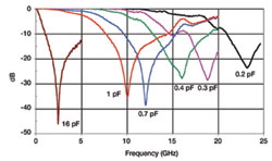 我們必須認(rèn)識到薄膜電容器用作帶阻濾波器是具有局限性的。因為薄膜電容器通常只能提供小電容值,所以它們局限于頻率相對較高的帶阻濾波器設(shè)計。如果涉及到低頻設(shè)計,必須采用其他的濾波器方法,通常是使用高Q值的多層射頻電容器。