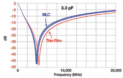 薄膜電容器(如圖1所示)還具有一項前面沒有提及的性能優(yōu)勢:它的響應(yīng)只有1個諧振點,因為這種器件使用單絕緣層設(shè)計封裝成多層陶瓷電容器(MLCC)。圖2顯示了這種薄膜電容器的部分S21前向傳輸損耗特性曲線。