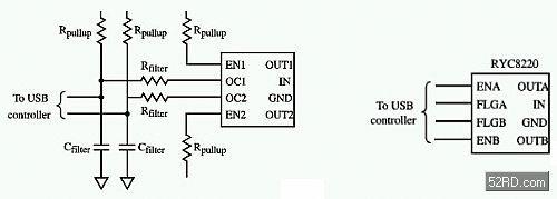 保護電源開關元件屬于硅元件,用于USB電源匯流排中,控制輸至USB埠的電源,并且有助于保護電路和元件,避免出現過電流現象。與PPTC元件相似,保護電源開關在過電流條件下執行跳閘動作,但是這一跳閘動作的執行分成兩個階段。元件在毫秒內即“動作”,將電流限制在一個預定的范圍內,這一范圍高于額定的工作電流。隨后,通知控制器已經發生了故障,控制器即可通過切換電源開關上的致能Pin來關閉這一埠。如果控制器未作出回應,則電源開關就反覆執行這一埠的開關狀態,以防止元件內部出現過熱損壞。