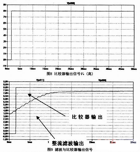 整流濾波后的信號V2,輸入到比較器IC4的正信號端,與IC4的負端電壓(V3=Vcc/2=4V))進行比較。當信號電平值大于4V時,比較器輸出高電平(V4接近運放的電源8V),當信號電平值小于4V時,比較器輸出低電平(V4接近0V),該兩個電平將控制后級檢測電路。圖8為AUX輸入信號后經比較器輸出高電平的仿真輸出,圖9為濾波和比較器的仿真輸出信號。