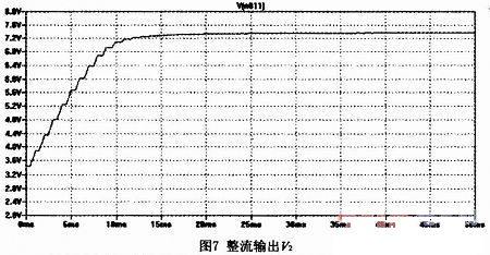 整流電路由D1、R10、C6組成(參見圖6)。它起到了平緩放大后信號的變化幅度,使它接近直流信號的作用。當V1和V2之間的壓差大于二極管的導通電壓時,二極管導通,對電容C6充電(同時一部分電流流過R10及比較器的輸入阻抗);當V1和V2的壓差小于二極管的導通電壓時,二極管截止,電容上的電荷通過R10(及比較器的輸入阻抗)放電。當放電到V1和V2的壓差再次大于二極管的導通電壓時,二極管導通,又開始充電的過程。該電路就反復地進行這樣的充放電過程。由于R10、C6值都很大,放電的速度很慢,電容電壓接近直流。由微分方程可得,放電時間T=RC1n(Vo/Vt),Vo為放電初始電壓,Vt為放電后的電壓,R為放電通路的電阻值,C為放電的電容值。可見R,C越大,放電時間越長,即電壓越不容易變化。圖7為整流濾波的仿真輸出。