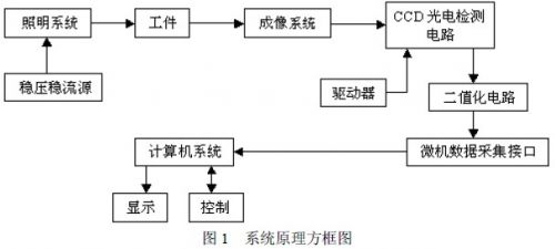 整個檢測系統由照明系統、被測工件系統、成像物鏡、CCD 光電檢測系統和計算機測控系統(8031 單片機和8279 鍵盤/顯示芯片等)構成。穩壓穩流調光電源為遠心照明系統提供穩定的照明光,被照明的工件經成像物鏡成像在線陣CCD 的光敏陣列面上。由于工件不透光,工件的像在中間部分形成暗帶,兩側形成亮帶。 暗帶的寬度就是工件尺寸所成像的大小。線陣CCD 在驅動脈沖的作用下完成光電轉換并產生視頻信號。其系 統原理圖如圖1。