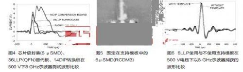 第二種處理小型集成電路的方法是使用支持模板。業(yè)界存在關(guān)于支持模塊這種方法的顧慮:由于小器件周圍有介電常數(shù)較高的材料,介電的存會在多大程度上改變集成電路與場板(field plate)之間的電容?被測器件與場板之間的電容是被測器件上應(yīng)力大小的決定因素。圖5顯示了固定在CDM裝置中一個模板內(nèi)的6 μSMD封裝。此時被測器件位于絕緣體中精心加工的孔,而絕緣體位于CDM裝置使用真空的場板中。圖6顯示了6LLP封裝使用與不使用FR4支持模板時以8 GHz示波器捕獲的波形。此圖顯示這模板在測試條件下僅為集成電路增加極小的應(yīng)力。