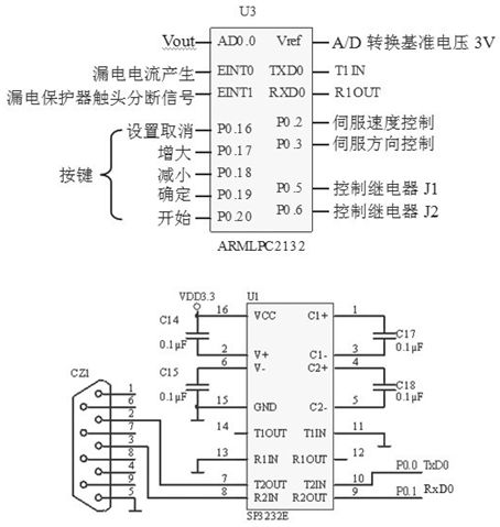 由于A/D轉換為10位,當輸入電壓為5V時,輸出數(shù)據(jù)值為1024(4FFH),因此最大分辨率為0.0049V(5V/1024)。若產生測試電流的回路電阻為12Ω時,漏電電流的分辨率為0.4mA(0.0049V/12Ω),完全滿足測試需要。漏電保護器的漏電電流產生的開始信號和動、靜觸頭斷開信號分別送入LPC2132的外部中斷輸入端,采用中斷的方式對漏電保護器動、靜觸頭的分斷時間進行檢測。P0.5與P0.6腳分別控制繼電器J1、J2的閉合和分斷,選擇三種不同測量范圍的測試電流。LPC2132與上位機之間采用串行通信,由于系統(tǒng)是3.3V系統(tǒng),所以要使用SP3232E進行RS-232電平轉換。SP3232E是3V工作電源的RS-232轉換芯片。A/D轉換及控制電路如圖4所示。