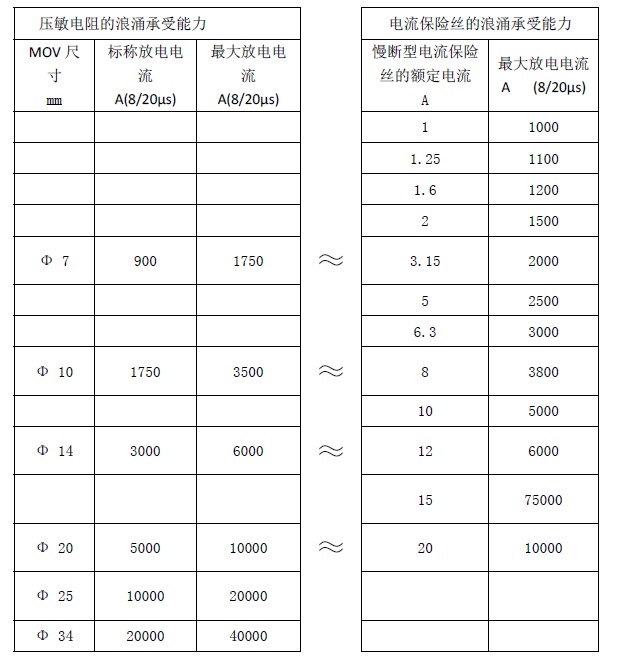 3.1 壓敏電阻MOV 與電流保險(xiǎn)絲FUSE 的浪涌電流承受能力對比,見表1
