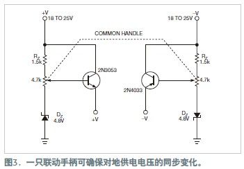由于晶體管的基-集電極反偏擊穿電壓各不相同,因此電路提供了一種改變電源電壓的簡(jiǎn)單方式(圖3)。隨著電壓的升高,與發(fā)射極連接的兩只LED都發(fā)光,而集電極只有一個(gè)LED發(fā)光(圖2中b和d)。±4V的基本電壓足夠用于檢測(cè)晶體管的基極或類型。如將電源電壓從±4V增至±15V,就可以測(cè)試很多種晶體管的發(fā)射極。考慮到串聯(lián)LED的壓降,這個(gè)范圍可為基射結(jié)提供最高26V以上的反向擊穿電壓。
