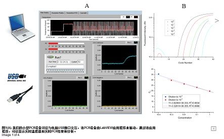 利用該系統(tǒng)同時(shí)運(yùn)行包含預(yù)加載PCR反應(yīng)物的三個(gè)聚合物,從抽樣到結(jié)果所花費(fèi)時(shí)間不到一小時(shí),并且允許采用大量生物的多樣性。利用熱敏電阻的實(shí)時(shí)溫度反饋,一個(gè)內(nèi)部比例積分微分(PID)芯片來處理溫度控制。該控制器由一個(gè)補(bǔ)償器,輸出裝置和傳感器反饋信號(hào)組成,反饋信號(hào)對(duì)于控制加熱器輸出功率,以及保持溫度是很必要的。使用LabVIEW軟件,我們對(duì)圖形用戶接口進(jìn)行編程,以顯示實(shí)時(shí)溫度,設(shè)置溫度,并且顯示來自三個(gè)通道的實(shí)時(shí)PCR結(jié)果 (如圖1A所示)。