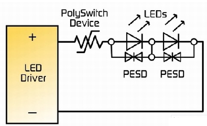 電源線耦合電壓瞬變和浪涌也可以降低LED的預期使用壽命,許多的LED驅動器容易受到不合適的DC電壓水平和極性的破壞。LED驅動器的輸出也可能被短路破壞或者摧毀。大多數LCD電視應用的LED驅動器包括內置安全裝置,包括熱關閉以及開路、短路LCD檢測。然而,可能還需要另外的過流保護元件以幫助保護集成電路(IC)以及其它敏感的電子元件。PolySwitch元件也可以被用來幫助防止當監測器的冷卻口被堵塞時可能發生的熱失控情況。由于其具有對溫度過高的情況有檢測和反應的能力,一個安裝合適的PolySwitch元件可以在LCD沒有足夠電壓運行的情況下中斷電流?! ?br />