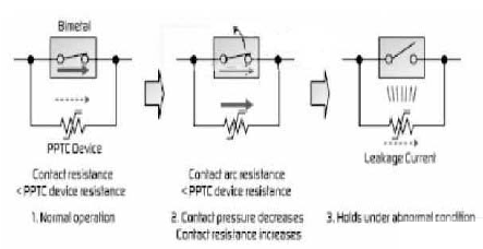 由于雙金屬觸點的低接觸阻抗,在正常操作下電流會流經(jīng)雙金屬觸點。當(dāng)出現(xiàn)諸如電動工具轉(zhuǎn)子鎖定這樣的異常事件時,電路中就會產(chǎn)生更高的電流,使雙金屬觸點打開,其接觸電阻也隨之升高。此時,電流就會分流到具備更低阻抗的PPTC器件上,同時也加熱雙金屬,使其打開并保持在鎖定的狀態(tài), 從而有助于防止各觸點之間電弧的產(chǎn)生。請參考圖2。