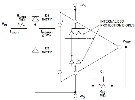 某些運(yùn)算放大器,如OP27等,內(nèi)置保護(hù)二極管,但仍然需要限流。如果運(yùn)算放大器具有保護(hù)二極管,它通常會規(guī)定最大差分輸入電流。原理示意圖上也應(yīng)顯示該保護(hù)電路。
