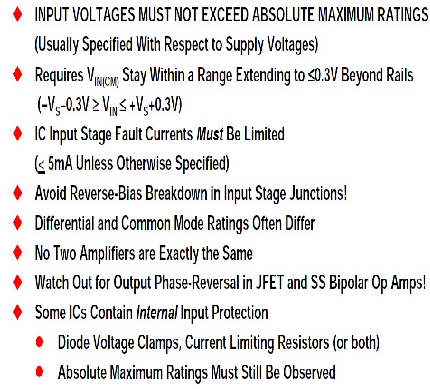 雖然可能存在一些例外,但務(wù)必注意:當(dāng)發(fā)生超出電源軌0.3 V以上的過壓狀況時(shí),多數(shù)IC運(yùn)算放大器需要輸入保護(hù)。