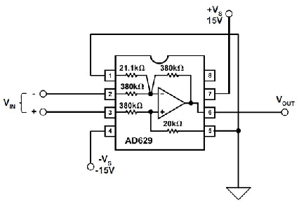 分析該拓?fù)浣Y(jié)構(gòu)可知,精密運(yùn)算放大器AD629周圍的阻性網(wǎng)絡(luò)充當(dāng)一個(gè)分壓器,將施加于VIN的共模電壓降低20倍。AD629同時(shí)以單位增益將輸入差模信號VIN轉(zhuǎn)換成以本地接地為基準(zhǔn)的單端輸出信號。增益誤差不超過±0.03 %或±0.05 %,失調(diào)電壓不超過0.5 mV或1 mV(取決于器件等級)。AD629的電源電壓范圍是±2.5 V至±18 V.