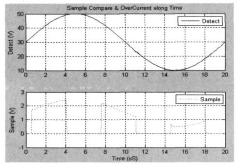 設(shè)檢測端電壓一般在10~50 V 之間變化,我們設(shè)置V(Detect)=SIN(30,20,50 k);周期為20μS;又設(shè)在采樣周期內(nèi),比較電壓為1 V;依據(jù)LDMOS管導(dǎo)通特性,設(shè)輸出漏電壓高于某值(本例為20伏)為過流,則分壓比設(shè)計為K = R4/ ( R3+R4)=5 k/(5 k+95 k)=1/20, 于是得到采樣電壓值為V(Sample)=V(Detect)*k =SIN(1.5,1,50 k),即最大值為2.5,最小值為0.5。同樣地,我們在采樣電路輸出端加上一個電容以消除電壓尖峰影響。該采樣電路仿真結(jié)果如圖6 所示。