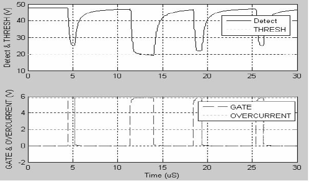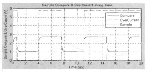 對圖3 進(jìn)行電路仿真,電源電壓VCC 為5.8 V,LDMOS 漏端檢測電壓在10~50 V 之間,柵端電壓脈沖頻率為132 kHz,占空比為60%的方波,SPICE仿真條件設(shè)置為VCC=5.8 V,V (Detect)= SIN(30,20,50k),V (Gate)=PULSE(0,5.8,0.5u,0.5u,0.5u,3u,7u),仿真結(jié)果如圖8 所示。在1.26 uS~4.17 uS 和8.25 uS~11.2 uS 這兩個采樣區(qū)間內(nèi),采樣電壓V(Sample)較比較電壓V(Compare)大,輸出為低電平(過流保護(hù),低電平有效);在15.2 uS~18.2 uS 采樣區(qū)間內(nèi),采樣電壓V (Sample) 較比較電壓V(Compare)小,輸出為高電平,對應(yīng)不發(fā)生過流情況;其他時間段內(nèi)柵電壓處于低電平,對應(yīng)LDMOS處于關(guān)斷態(tài),不可能發(fā)生過流,故過流輸出信號OverCurrent 為高電平。仿真結(jié)果表明,該電路確實能很好地實現(xiàn)過流保護(hù)的功能。