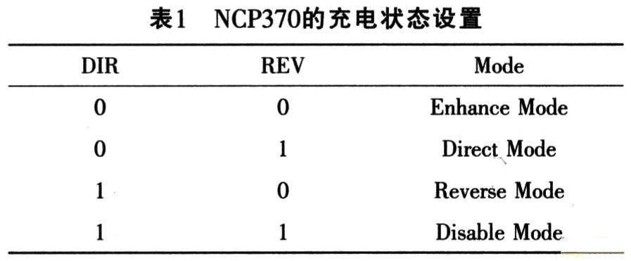 將NCP370的DIR端強制拉低,并將DEV端拉高,NCP370即可進(jìn)入正向充電狀態(tài)。而將DIR端置高時,OUT端會與IN端斷開,具體的充電狀態(tài)設(shè)置如表1所列。另外,DIR也會受到OVLO或U-VLO故障的影響(FLAG有效)。