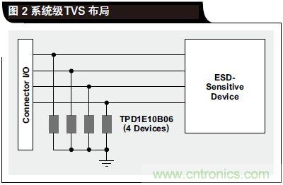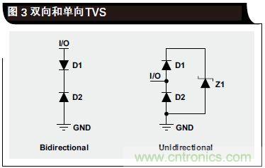 立即沿這條通路接地。在單向 TVS 情況下,只要 D2 和Z1 都不進入其擊穿區(qū)域,則電壓信號會在接地電壓以上擺動。當正ESD電擊擊中I/O線路時,D1變?yōu)檎蚱茫鳽1 先于 D2 進入其擊穿區(qū)域;通過 D1 和 Z1 形成一條接地通路,從而讓 ESD 能量得到耗散。當發(fā)生負ESD 事件時,D2 變?yōu)檎蚱茫珽SD能量通過 D2接地通路得到耗散。由于 D1 和 D2 尺寸可以更小、寄生電容更少,單向二極管可用于許多高速應用;D1 和 D2 可以“隱藏”更大的齊納二極管 Z1(大尺寸的原因是處理擊穿區(qū)域更多的電流)。