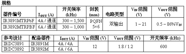 全新雙輸出器件對5V到12V輸入、1V到21V輸入 (使用5V外偏置) 單電源軌操作進行了優化。IR3891和IR3892采用了纖巧的5×6mm PQFN封裝,在165mm2的小巧占位面積內,分別為需要4A/通道或者6A/通道的應用帶來極為緊湊的解決方案。