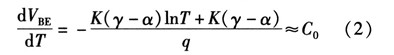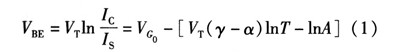 式中VG為帶隙電壓,γ和α為器件參數,A代表了那些方程推到過程中與溫度無關的常量。因為Vt=kt/q,可以得到VBE隨溫度上升是降低的。其關于溫度變化的方程為