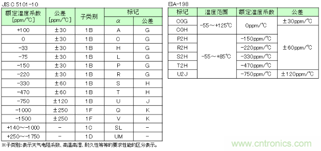 表1:溫度補償用獨石陶瓷電容器的溫度系數(shù)值和公差以及其標(biāo)記