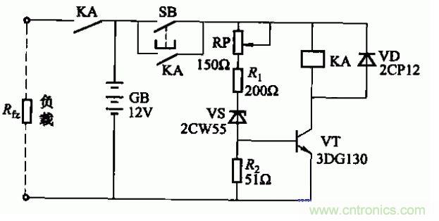 蓄電池深度放電,會(huì)使極板硫化,縮短蓄電池的使用壽命。為此可設(shè)置放電保護(hù)器。電路如圖所示。當(dāng)蓄電池電壓下降到終止值(可由電位器RP來改變動(dòng)作閾值),繼電器KA釋放,切斷負(fù)載回路,使蓄電池停止放電。