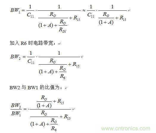 從上式看出,當A較小時,R6的加入確實有擴展帶寬的作用,但R6的取值不能太大。當R6取得很大時,x=R0/R6趨近于0,BW2/BW1趨近于1,也就不能擴展帶寬了。
