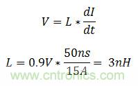 用電子負載測試電源的瞬態響應很常見。對許多系統軌(如服務器的3.3V或5V總線)而言,電子負載很容易配置為在2-10A/us的范圍內汲入電流的模式。但是,內核電壓可能需要轉換速率比這些水平高兩個數量級。高轉換速率測試中的一個主要限制因素是負載路徑中的寄生電感。要以300A/us的速率為0.9V輸出轉換15A的電流,公式1計算出的最高電感是3nH。作為參考,成圈狀通過電流探頭的16級導線的1英寸片可將20nH的電感添加到負載路徑中。很明顯,需要另一種電流汲入方法。
