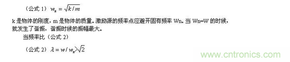 頻率可分為固有頻率Wn和激勵頻率W,固有頻率源于產品的結構特征,由質量、質量分布、質心位置、剛度等多個因素和多個因素間的相互作用所確定。固有頻率計算公式為(公式1)k是物體的剛度,m是物體的質量。激勵源的頻率點應避開固有頻率Wn。當Wn=W的時候,就發生了諧振,諧振時候的振幅最大。