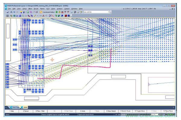 要使用草圖布線,設(shè)計人員只需畫一條線來指示路徑,布線器會將所選擇的網(wǎng)絡(luò)沿著這個路徑自動布出。在為數(shù)條、數(shù)十條甚至數(shù)百條飛線布線時,草圖布線器的速度要比手動布線快上數(shù)倍。圖 3 中選中了22 條數(shù)據(jù)線路。最常見的草圖布線方法會使用現(xiàn)有的過孔扇出,而不會增加任何額外的過孔。