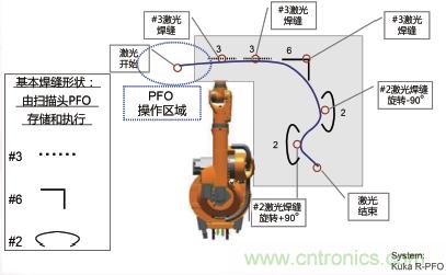 除了激光拼焊,激光飛行焊也已經(jīng)被廣泛應(yīng)用于汽車車身及其他零部件的焊接。激光飛行焊是將振鏡焊接頭與機(jī)器人的運(yùn)動(dòng)結(jié)合起來(lái),實(shí)現(xiàn)高效靈活的激光焊接。振鏡(PFO)及飛行焊的原理見(jiàn)圖4、5、6。其中PFO可以通過(guò)兩片鏡片的旋轉(zhuǎn),實(shí)現(xiàn)激光焦點(diǎn)在工件上的快速靈活移動(dòng)和定位,可以大大提供激光焊接時(shí)的動(dòng)態(tài)性能,更加高效。而機(jī)器人則可以擴(kuò)展焊接范圍,以實(shí)現(xiàn)更大零件的焊接。兩者的結(jié)合,則可以實(shí)現(xiàn)優(yōu)勢(shì)互補(bǔ),達(dá)到高效、靈活、低成本的激光焊接。